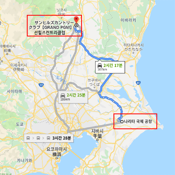 공항 기준나리타 공항에서 차로 약 2시간 20분 소요 |