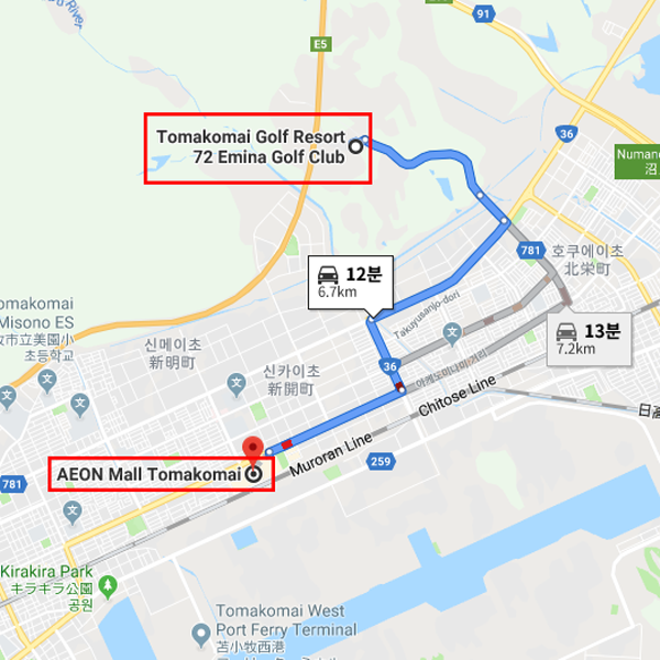 도마코(토마코)마이골프리조트72 에미나골프클럽 신치토세 공항에서 차로 약 20분 소요 도마코(토마코)마이골프리조트72 에미나골프클럽 쇼핑몰 이온몰 도마코마이점까지 차로 약 12분 소요
