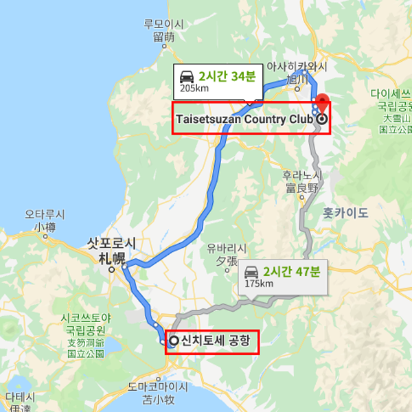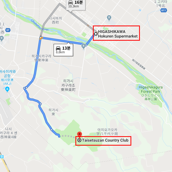 타이세츠잔 컨트리클럽 신치토세 공항에서 차로 약 2시간 34분 소요 타이세츠잔 컨트리클럽 수퍼마켓 호쿠렌샵 히가시카와점까지 차로 약 13분 소요