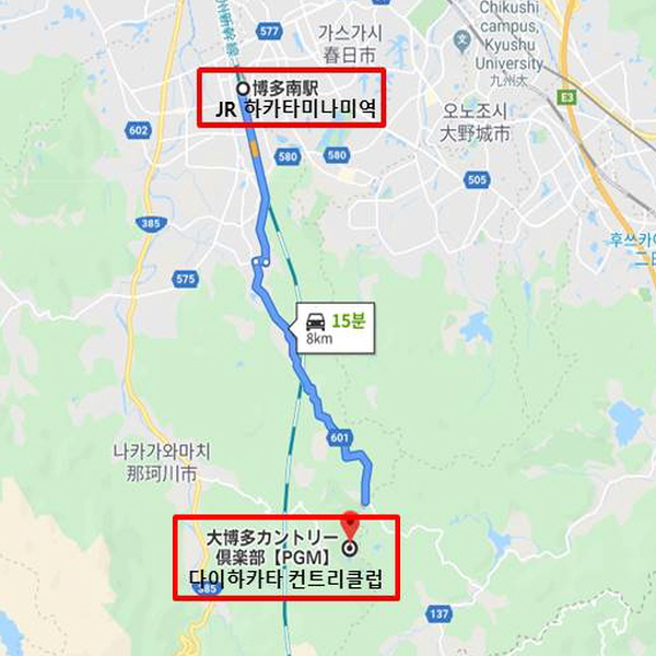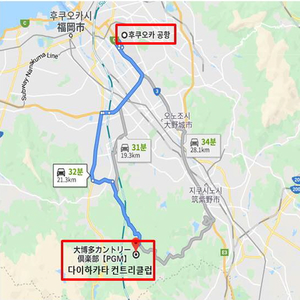 다이하카타 컨트리클럽은 후쿠오카 공항에서 차로 약 30여 분 거리에 있는 골프장으로 후쿠오카 근교에 위치해 접근성이 좋아 골프 플레이와 관광하기에도 적합하다. 전체적으로 구릉 코스이며, 각각의 개성을 즐길 수 있는 3개의 코스로 이루어져 있다. 첫 번째 히노키(桧) 코스는 거리가 있고 전반은 플랫하며 후반은 약간 기복이 있다. 벙커로 둘러싸여 있는 그린은 기복이 있어서 전략성이 필요한 코스이다. 두 번째 마츠(松) 코스는 거의 플랫하며 거리도 있고 연못도 많다. 세 번째 스기(杉) 코스는 3코스 중 거리는 가장 짧지만, 지형의 변화가 많다. 9번 홀은 티 샷 200m 전부터 그린의 앞까지 연못으로 되어있고 짧은 미들 홀로 명물 홀이다. |