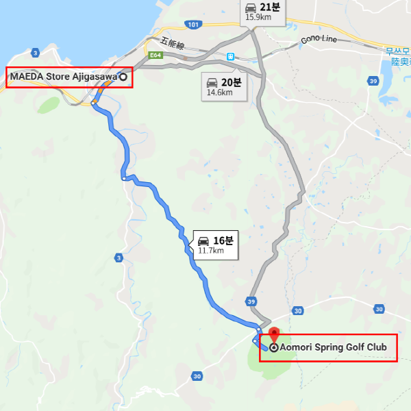 아오모리 스프링스 골프클럽 아오모리 공항에서 차로 약 50분 소요 아오모리 스프링스 골프클럽 슈퍼마켓 마에다스토어 아지가사와점(マエダストア鯵ヶ沢店)까지 차로 약 15분 소요