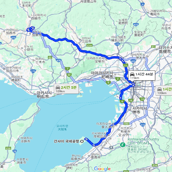 간사이 국제 공항에서 차로 약 1시간 44분 소요