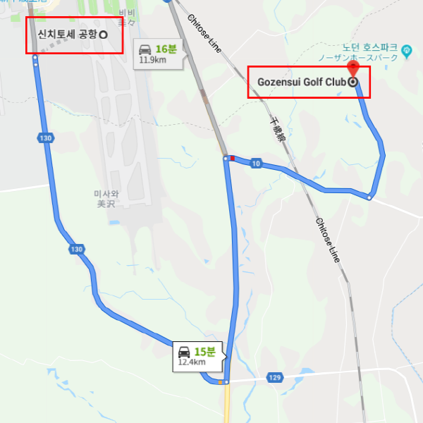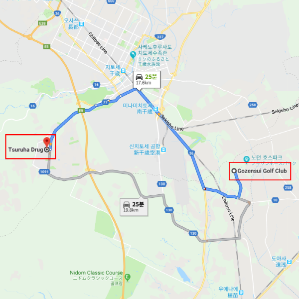 고젠스이 골프클럽 신치토세 공항에서 차로 약 30분 소요 고젠스이 골프클럽 츠루하드럭 치토세코요다이점까지 차로 약 30분 소요