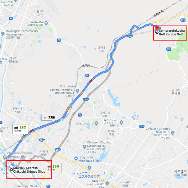 골프장 주변수퍼마켓 맥스벨류 익스프레스 치쿠시에키마에점 까지 차로 약 15분 소요 |