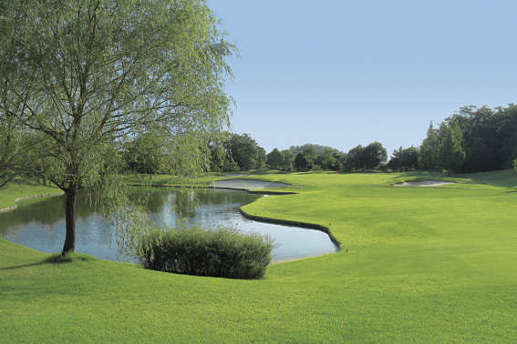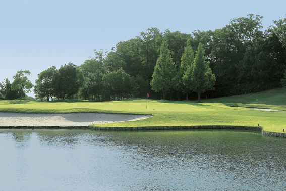 좌측에 연못이 있는 내리막 경사의 쇼트홀 |