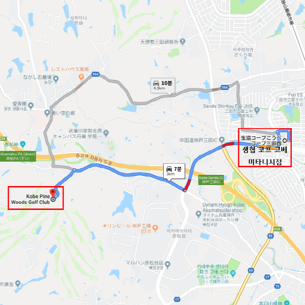 골프장 주변수퍼마켓 생협 코프 고베 미타니시점까지 차로 약 7분 소요 |